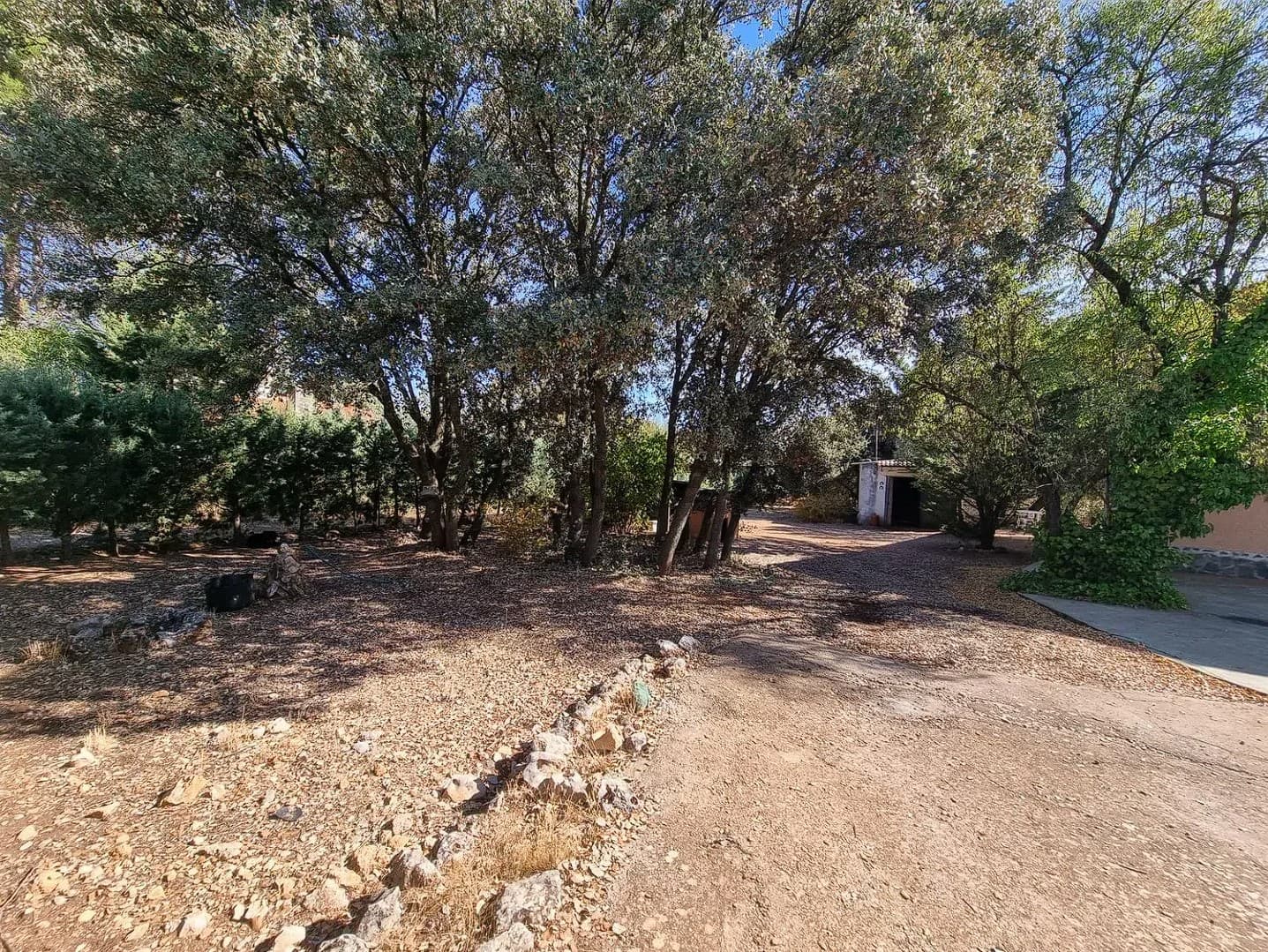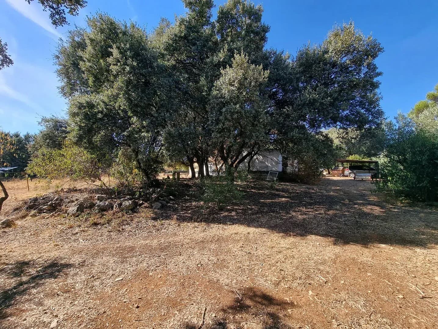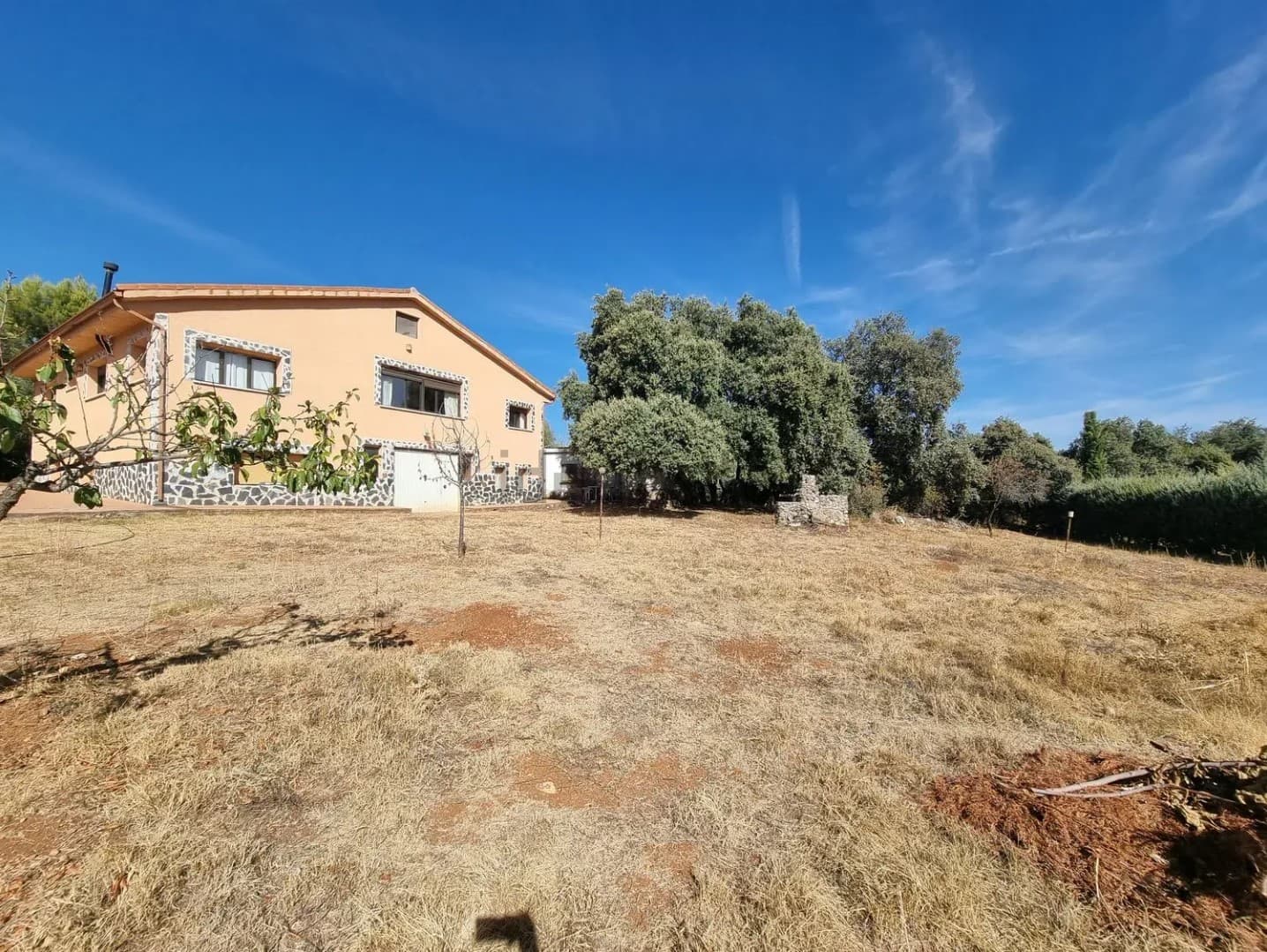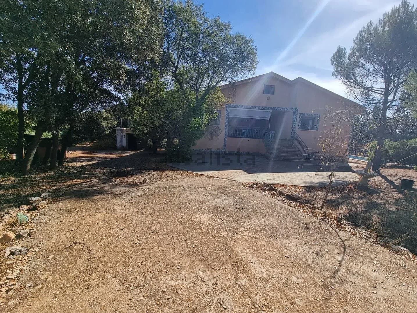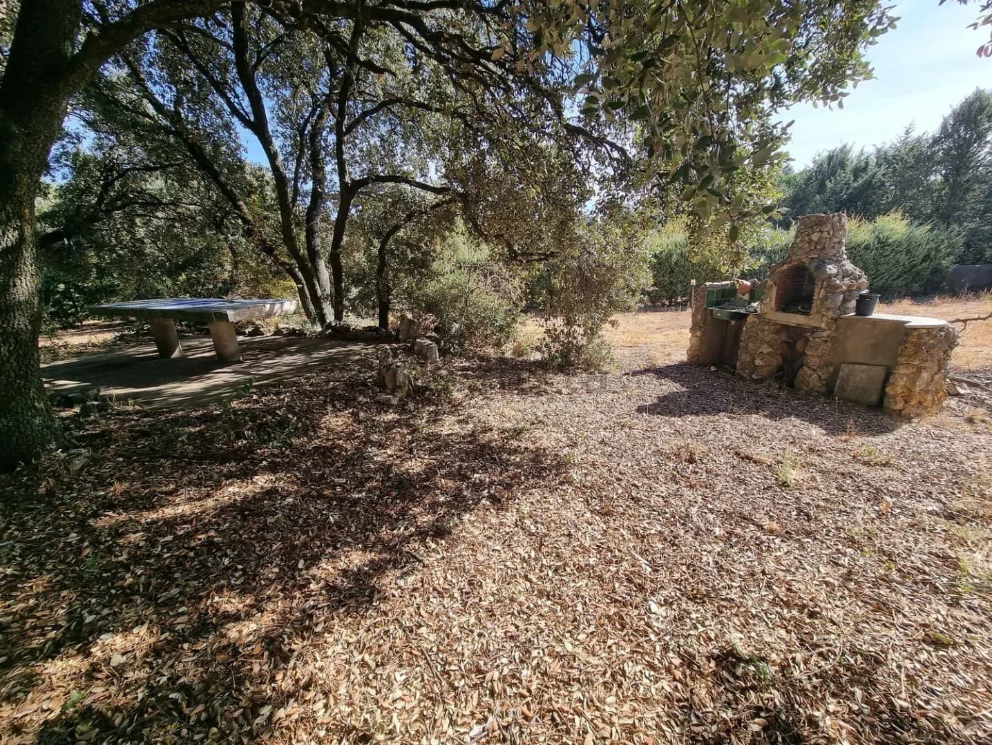 La vivienda se encuentra en una parcela de 3200 m2 prácticamente sin pendientes. Dispone de piscina, almacén, establo, cubierta para dos vehículos y zona comedor con barbacoa.