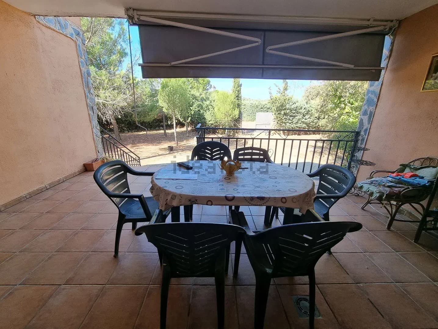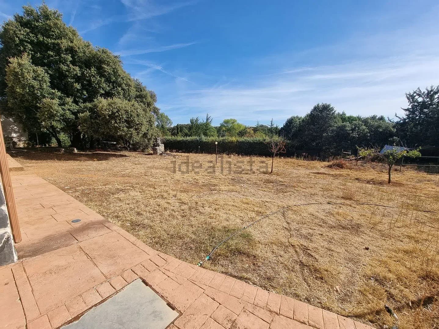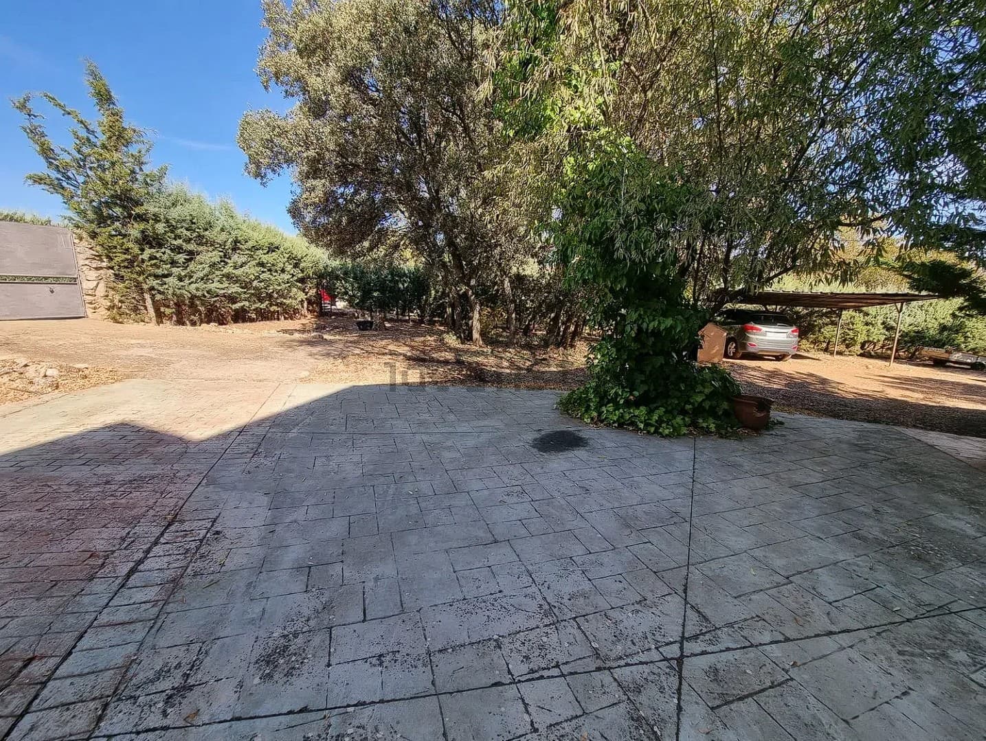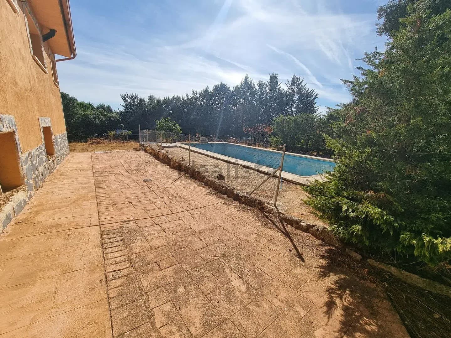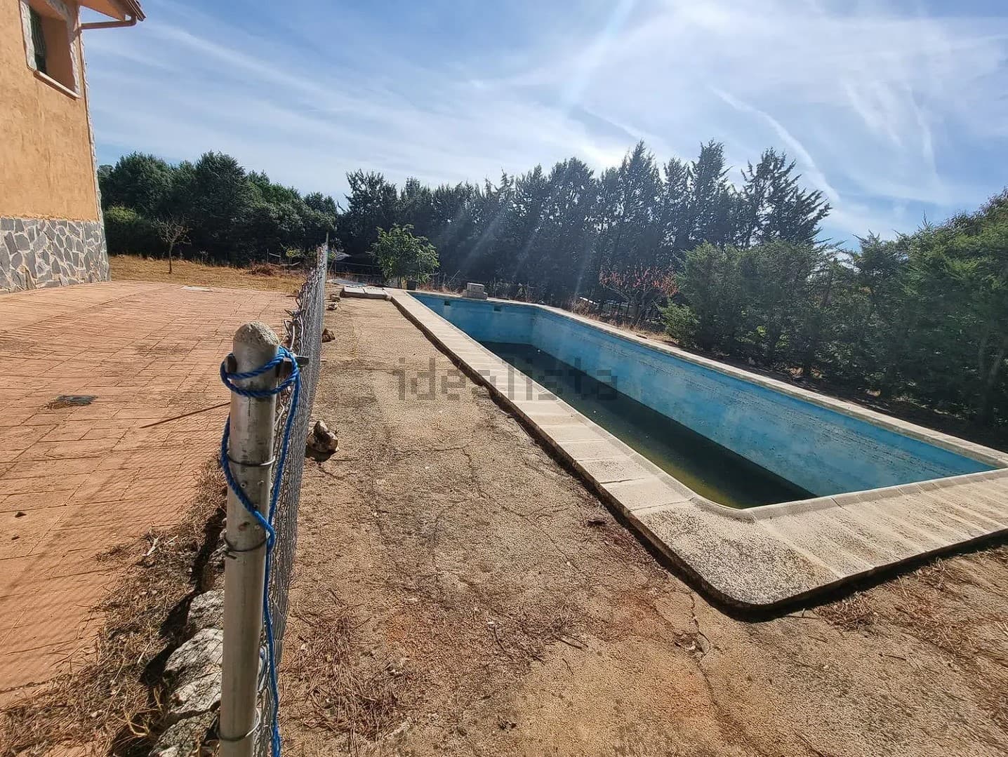 La vivienda se encuentra en una parcela de 3200 m2 prácticamente sin pendientes. Dispone de piscina, almacén, establo, cubierta para dos vehículos y zona comedor con barbacoa.